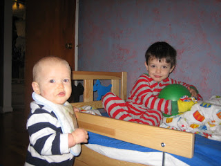 Dimanche matin Ismael avait était invité à passer 45 minutes à " the little gym" par une petite copine, où il était monté sur la poutre, les barres fixes, avait sauté dans tous les sens et fait des galipettes (Désolée, pas de photos). Tout cela l'avait mis d' humeur sportive car le soir il voulait encore faire du saut en hauteur. C' est mon bras qui sert de barre.